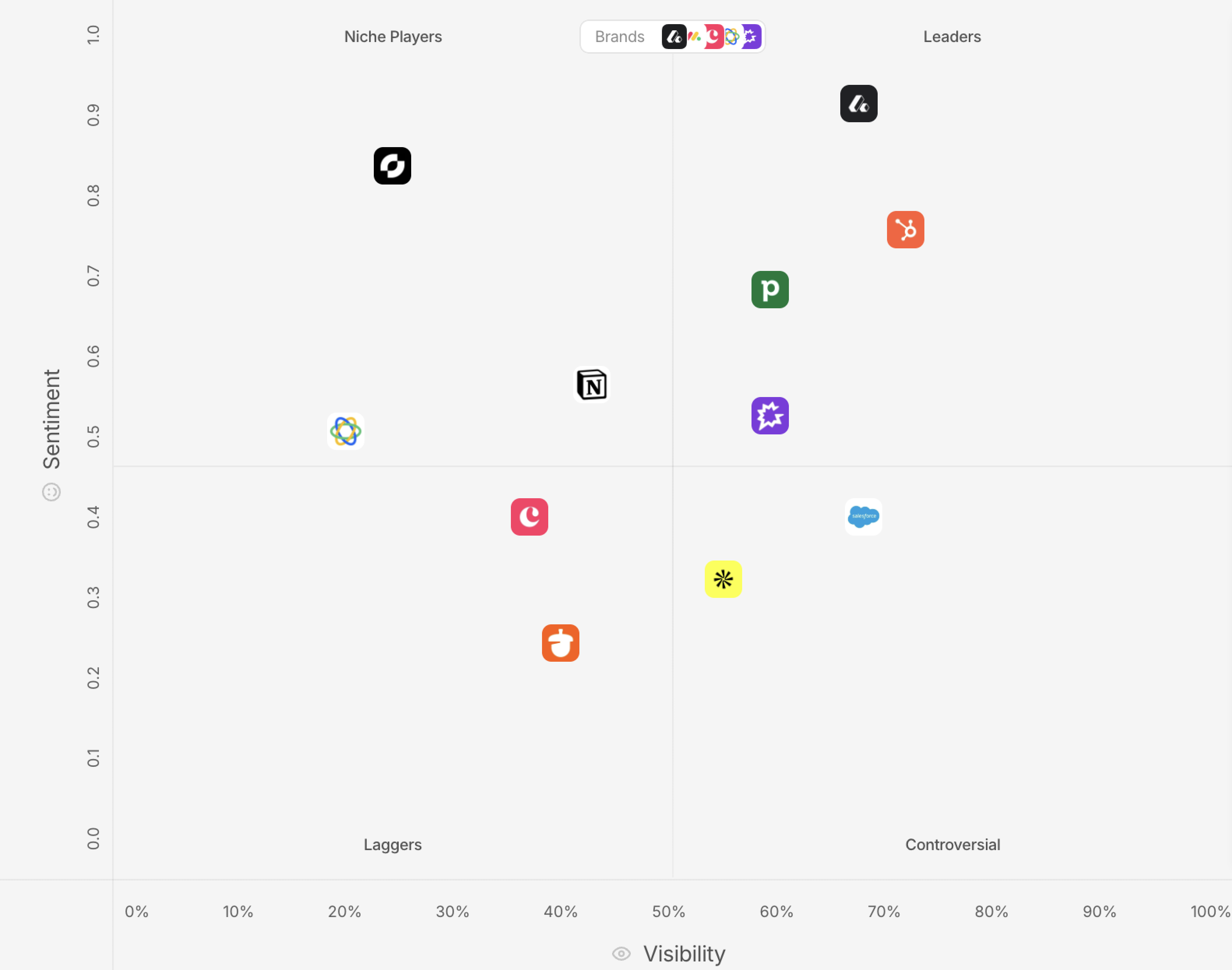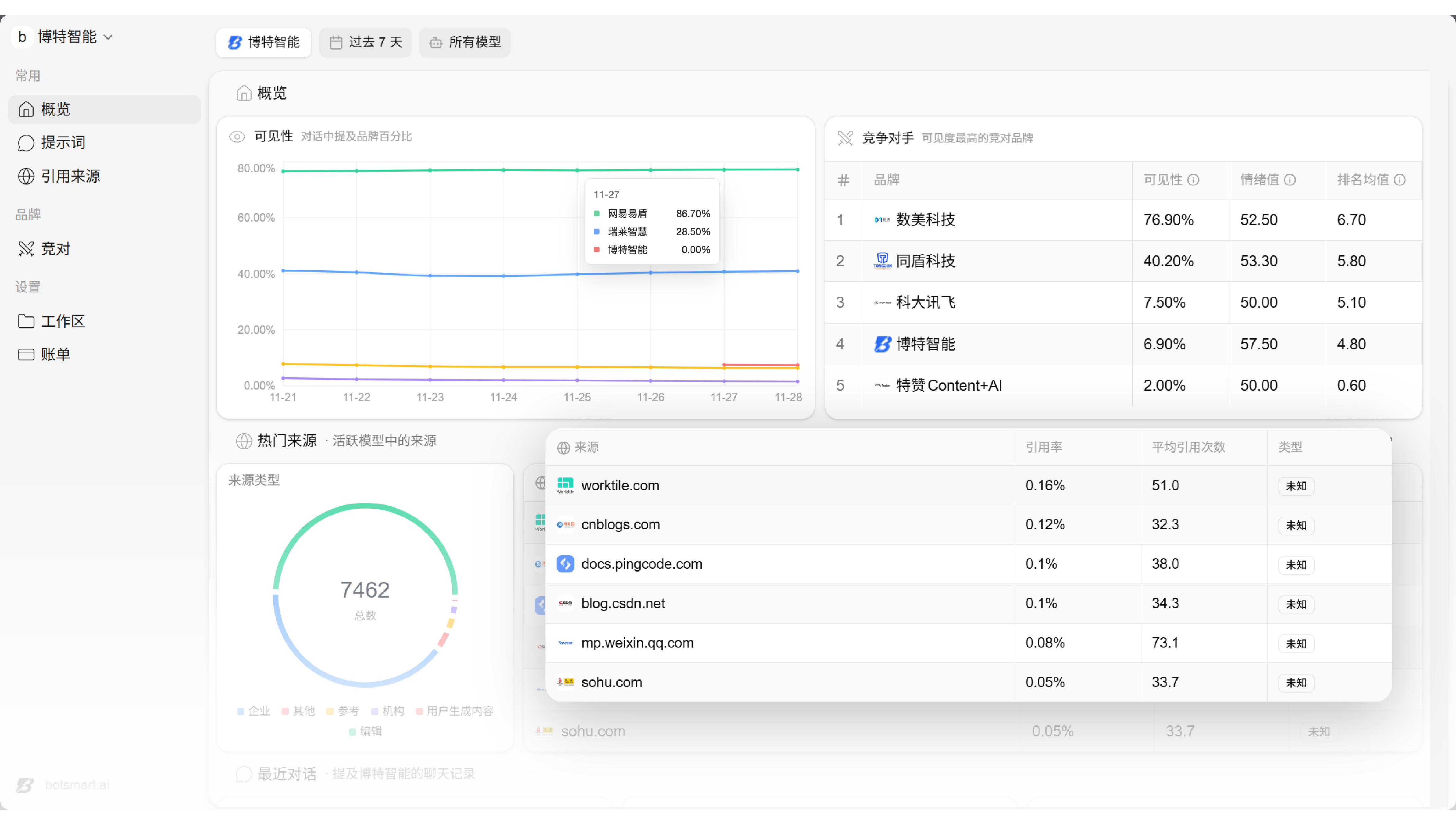 查看您的品牌在聊天记录中提及的频率,了解您在对话中出现的频率。
